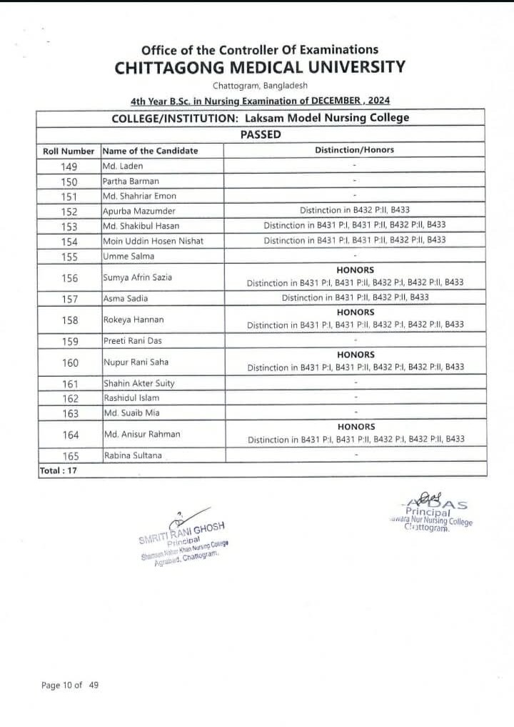 4th year B.Sc in Nursing final exam result